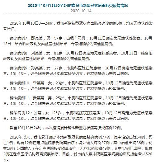 荔枝新闻讯 2020年10月13日0—24时,青岛市新增新型冠状病毒肺炎确诊病例6例,均系无症状感染者转归。