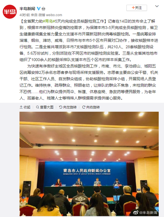 记者在14日的发布会上了解到,根据本市新冠肺炎疫情防控需求,为保障本市3-5天完成全员核酸检测,省卫生健康委调集全省力量全力支援青岛市开展新冠肺炎病毒核酸检测。一是统筹安排淄博、烟台、潍坊、威海、日照市与本市5个区市开展对口协作,接收核酸样本进行检测。二是全省共增派到本市7支核酸检测队伍,共210人、28套核酸检测设备、5.6万份试剂,分别派驻在不同区市的核酸检测实验室。三是从全省其他地市组织了1000余人的核酸采样队支援本市五个区市的祥本采集工作。
