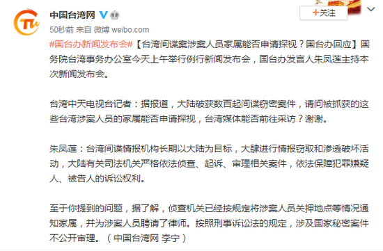台湾中天电视台记者:据报道,大陆破获数百起间谍窃密案件,请问被抓获的这些台湾涉案人员的家属能否申请探视,台湾媒体能否前往采访?谢谢。