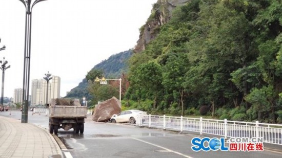 10月14日上午11时许,宜宾市吊白路段突现巨石滚落,一辆汽车被落石砸中。记者在现场了解到,事故未造成人员伤亡。