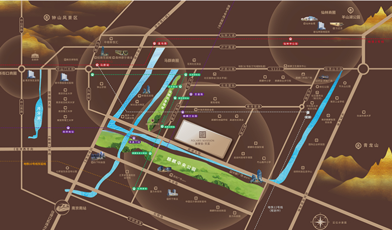 项目南面是约300万方的麒麟中央公园,北面紧邻中海国际社区&启迪方洲两大社区商业街,东侧为启迪科技城华清园,西侧临近运粮河景观带。周边临近南京外国语学校仙林分校麒麟小学、南京外国语学校仙林分校麒麟小学中学,以及麒麟科创园第二小学(力小合作办学)等教育配套。