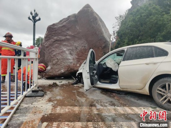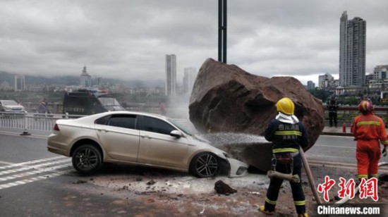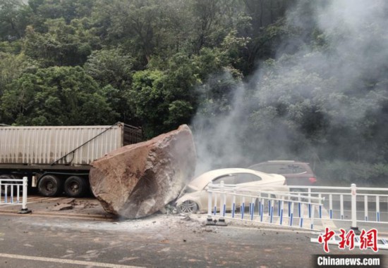 网友提供的一段视频中显示,现场滚落的大石头正好落在靠近道路中间,砸中一辆轿车和路中间的隔离栏,轿车车头部分受损严重,车头引擎部分正冒着烟,有一些明火,过往市民迅速使用灭火器进行先期处置。