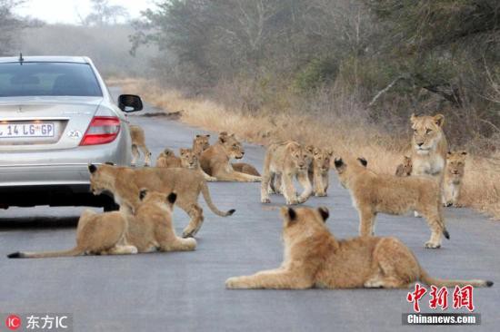 资料图:南非克鲁格国家公园,一群狮子趴在马路中间休息,堵住了过往车辆的去路。 图片来源:东方IC 版权作品 请勿转载