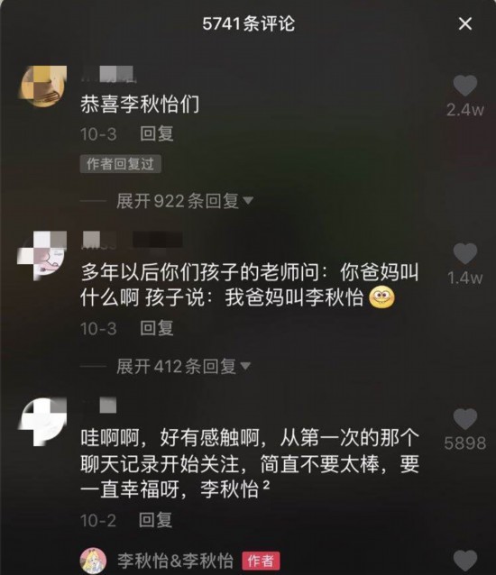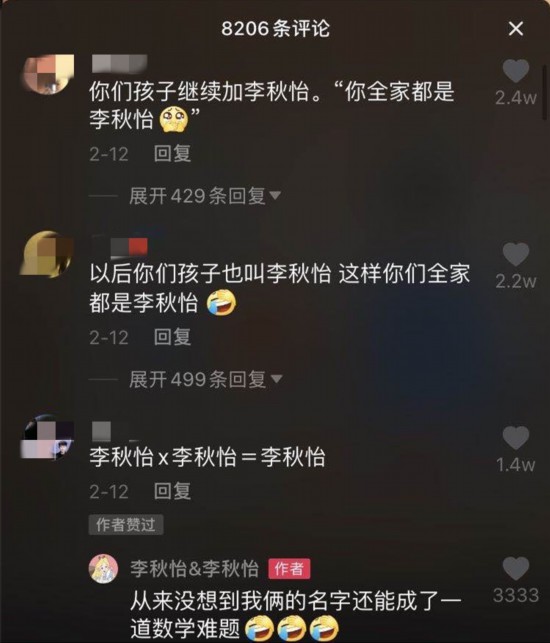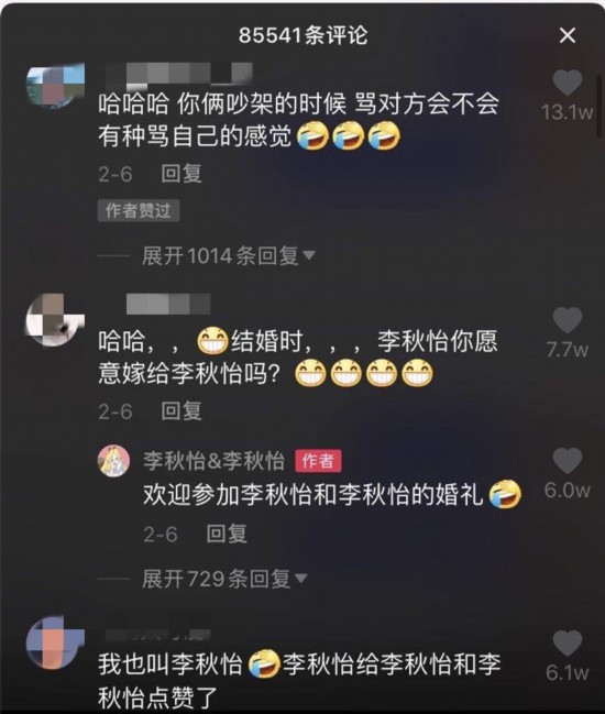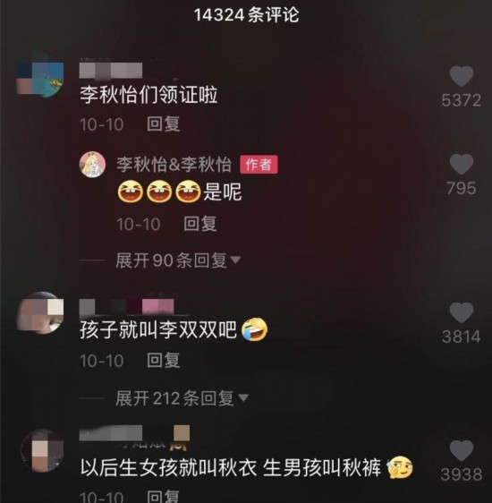 二人从相识到结婚的消息,不仅得到了父母的祝福,也得到了来自五湖四海网友们的庆贺。网友评论“这是要有多特别的缘分,才能让两个名字一样的人走到一起?”网友也调侃:“婚礼现场是不是得写:欢迎参加李秋怡&李秋怡的婚礼?”“以后吵嘴,是不是都像在说自己?”“以后孩子上学,母亲的名字该写谁呢?”甚至还有网友已经把两人孩子名字都取好了,“就叫李双双。”