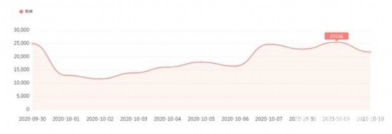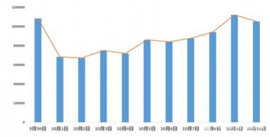 报告指出,在9月30日至10月10日共计11天监测期内,系统共收集“中秋国庆”相关“消费维权”类信息9565046条,日均信息量87万余条。监测期间,“消费维权”信息呈首尾较高、中间较低态势。从10月1日起,相关信息呈曲线波动走势,但每日相关舆情数量总体较为均衡。10月9日最多,为1116155条。