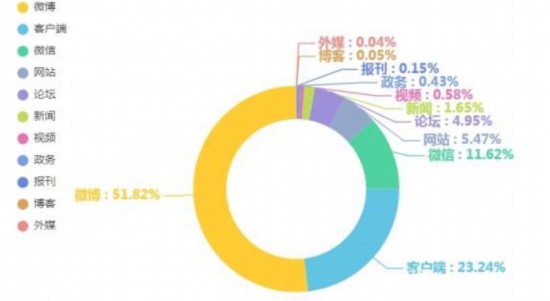 在信息传播渠道上,“中秋国庆”期间“消费维权”类信息传播渠道主要有微博、客户端、微信、网站、论坛、新闻等。其中,微博信息量最高,占比51.82%;其次是客户端,信息量占比23.24%;第三是微信,信息量占比11.62%。