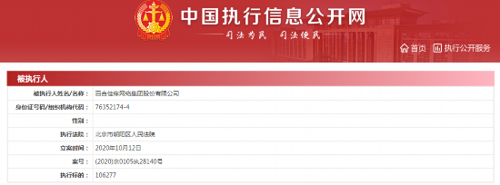 中国网科技10月15日讯 据中国执行信息公开网消息,近日,百合佳缘网络集团股份有限公司被北京市朝阳区人民法院列为被执行人,执行标的106277元,案号为(2020)京0105执28140号。