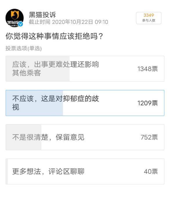 对于春秋航空是否该拒绝上述旅客乘机,网络上支持和反对的观点各执一词。支持者认为应该拒载,因为可能危害航空安全;反对者则认为是对于抑郁症乘客的歧视。在黑猫投诉发起的投票上,双方占比相差无几。
