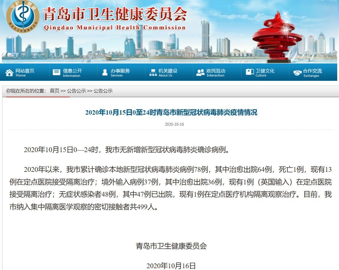 2020年10月15日0—24时,青岛市无新增新型冠状病毒肺炎确诊病例。