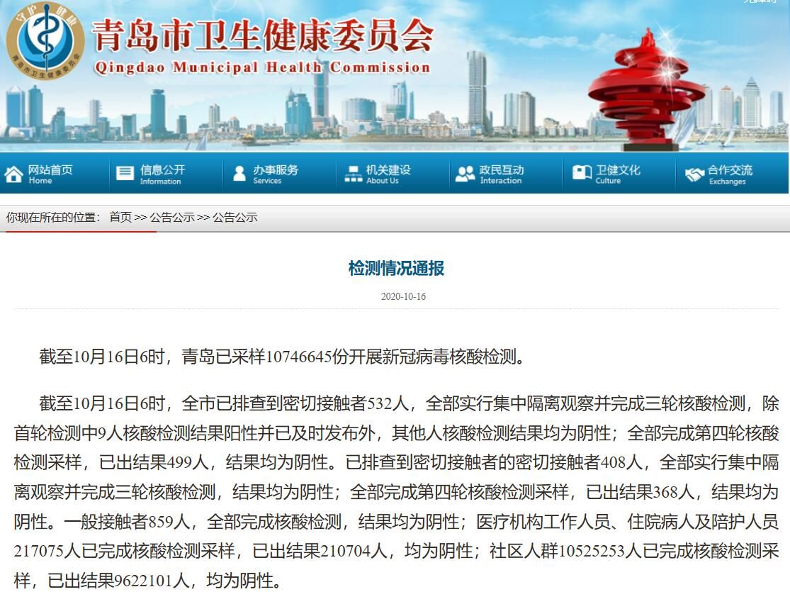 截至10月16日6时,青岛已采样10746645份开展新冠病毒核酸检测。