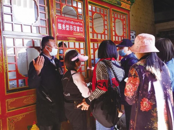 进入布达拉宫正大门后,工作人员会在服务型示范窗口发放布达拉宫免费参观券,游客可拿着这张免费券进入布达拉宫免费参观。“想要免费参观布达拉宫,全国各地的游客可通过布达拉宫官方微信公众号和布达拉宫官方网站进行预约,采取这种无接触预约方式,也是为了全力推动常态化疫情防控工作。”旦增多吉说,同时,他们还制作了布达拉宫免费参观券,给前来参观的游客留下一份纪念。另外,他们还采取了错峰、限流等措施,前来参观的游客和群众必须佩戴口罩,接受体温测试,保障广大游客安全、有序、文明参观布达拉宫。