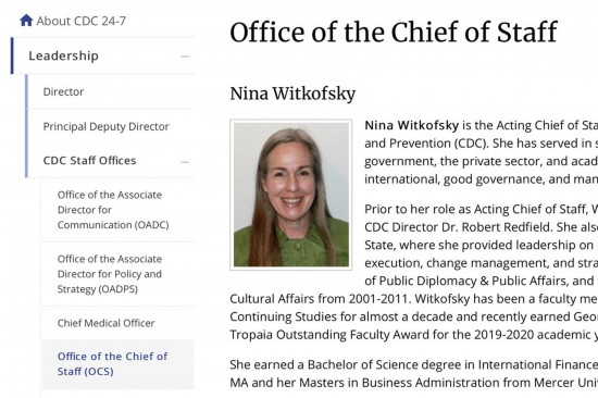 其中一人,尼娜·维特科夫斯基(Nina Witkofsky)最终成了CDC代理办公室主任,是雷德菲尔德的得力助手。另一人特雷·莫勒(Trey Moeller)担任代理副主任,也开始出席科学会议。
