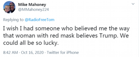 还有一位网友则调侃说:“我希望有人能像那个戴着红口罩的女子相信特朗普一样相信我。我们都能如此幸运。”↓