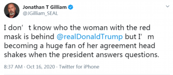 前美国海军海豹突击队、联邦调查局探员乔纳森·吉利亚姆(Jonathan Gilliam)就在推特上写道:“我不知道这位在特朗普身后戴红口罩的女子是谁,但看到总统回答问题时她点头同意,我已经成了她的超级粉丝。”↓