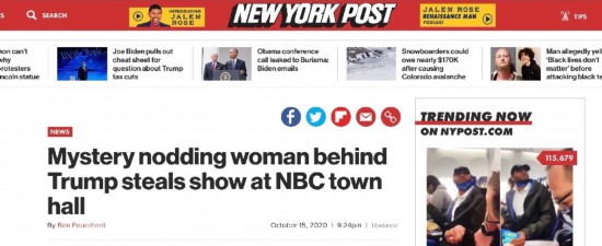美国《纽约邮报》15日以此为题报道称,这名身份不明的女观众当晚坐在特朗普的身后,聆听担任主持人的全国广播公司新闻主播萨凡娜 古思里(Savannah Guthrie)和特朗普激辩。