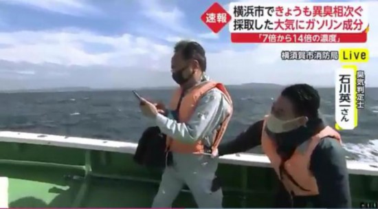 近日,日本神奈川县多地出现异常臭气,图为调查人员在附近海域进行调查。(图片来源:日本富士电视台视频截图)