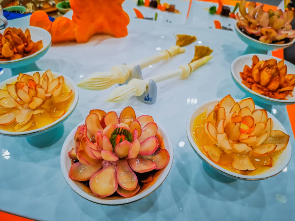 在总决赛现场,还设置了婚宴、寿宴、西游宴等8种宴席摆盘,集中展示了包括淮扬菜传统名菜和淮扬创新菜在内的百余道菜品,为观众奉献了一场美食与文化的饕餮盛宴。为践行节约、杜绝浪费,本次比赛中选手制作的菜肴均免费供市民品尝,为到场参观的市民朋友带来视觉和味觉上的双重享受。