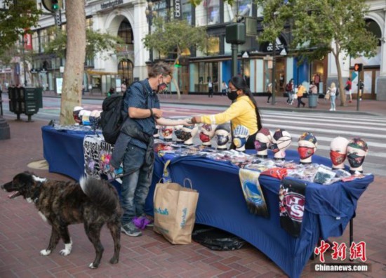 美国加州旧金山市民金迪在路边售卖自制口罩。中新社记者 刘关关 摄