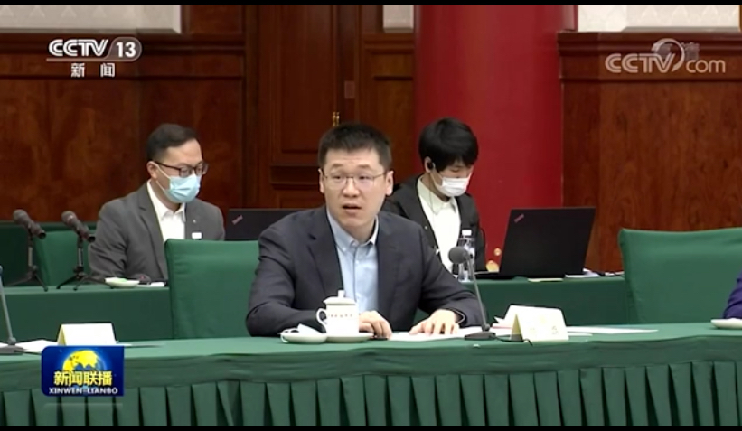 ▲10月15日,拼多多CEO陈磊(前排发言者)作为特邀企业代表,受邀参加全国政协双周协商座谈会,提出培养数字农业电商人才、制订农产品分级分类标准等解决农产品销售难的建议。(图片来源:央视《新闻联播》)