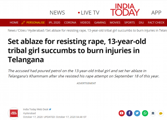 事情要从上月说起。根据警方说法,印度某部落一名13岁少女生前受雇于该国南部特伦甘纳邦一男子家中做家务。9月18日这天,该男子曾试图强奸她。当她反抗时,该施暴者将汽油倒在她身上并纵火焚烧。结果,这名少女全身70%被烧伤。
