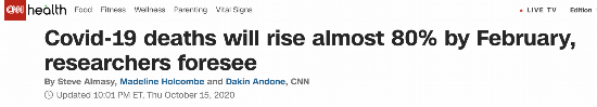 另据美国有线电视新闻网(CNN)15日报道,华盛顿大学医学院卫生计量与评估研究所的模型预测,到2021年2月,美国新冠肺炎死亡病例数将增加约17.1万例,达389087例,或上升78%。