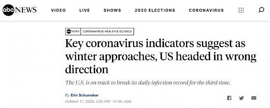 据美国广播公司(ABC)17日报道,随着美国中西部、东北部等地的确诊病例数持续攀升,美国新冠肺炎确诊病例正走向第三个高峰,或将第三次打破每日新增确诊病例数纪录。