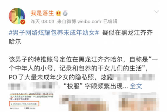 红星新闻10月18日消息,10月17日,微博网友@我是落生 发文称,一男子在社交媒体推特上炫耀自己包养未成年幼女,并配有多张大尺度照片。根据爆料内容,记者看到,一个名为“爱萝莉”的推特账号自称是“一个中年人的小号”,将此号用来“记录和包养的干女儿们的真实生活”。
