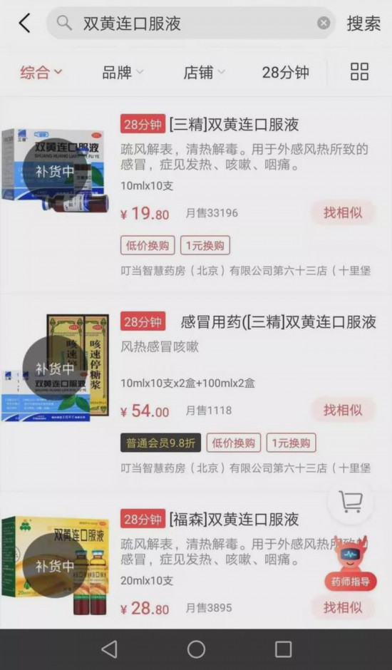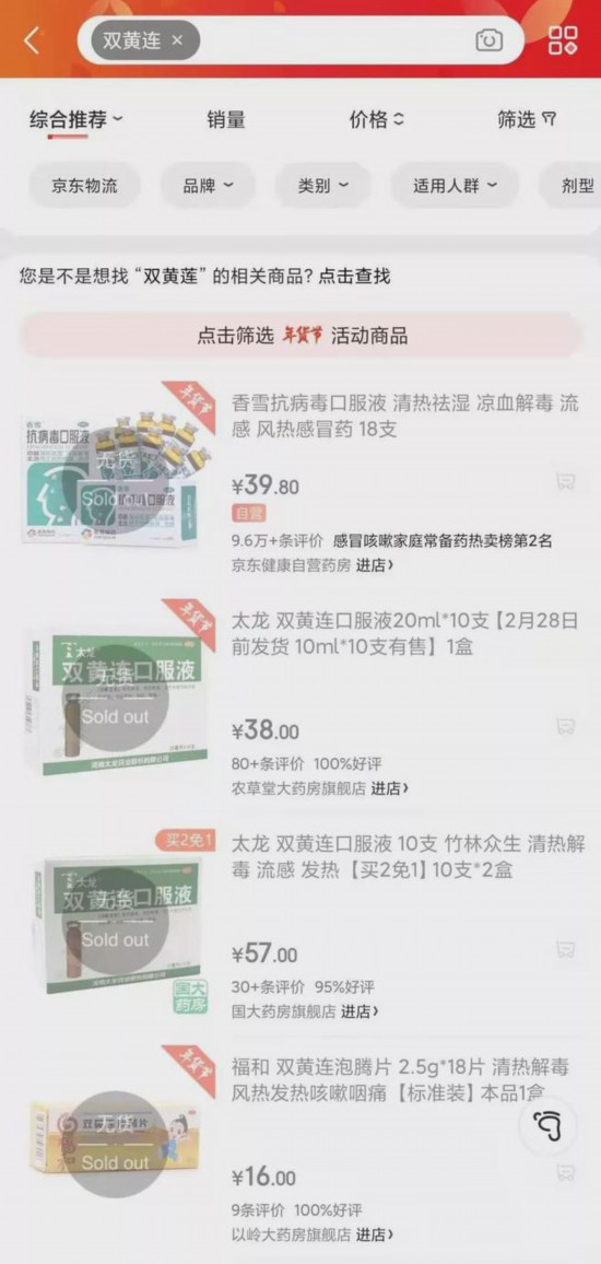 火了的不止双黄连上述消息一出后,迅速在社交媒体形成刷屏,双黄连口服液也在各大渠道被一扫而空。当晚查询的几个电商平台,均为售空状态。一夜之间,双黄连口服液代替口罩成为了新晋“断货王”。