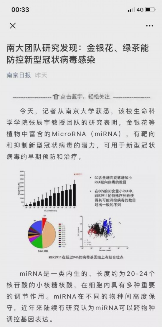 而就在此之前,南京日报曾报道,南大团队研究发现:金银花、绿茶能防控新型冠状病毒感染。报道中称,记者从南京大学获悉,该校生命科学学院张辰宇教授团队的研究表明,金银花等植物中富含的MicroRNA(miRNA),有靶向和抑制新型冠状病毒的潜力,可用于新型冠状病毒的早期预防和治疗。