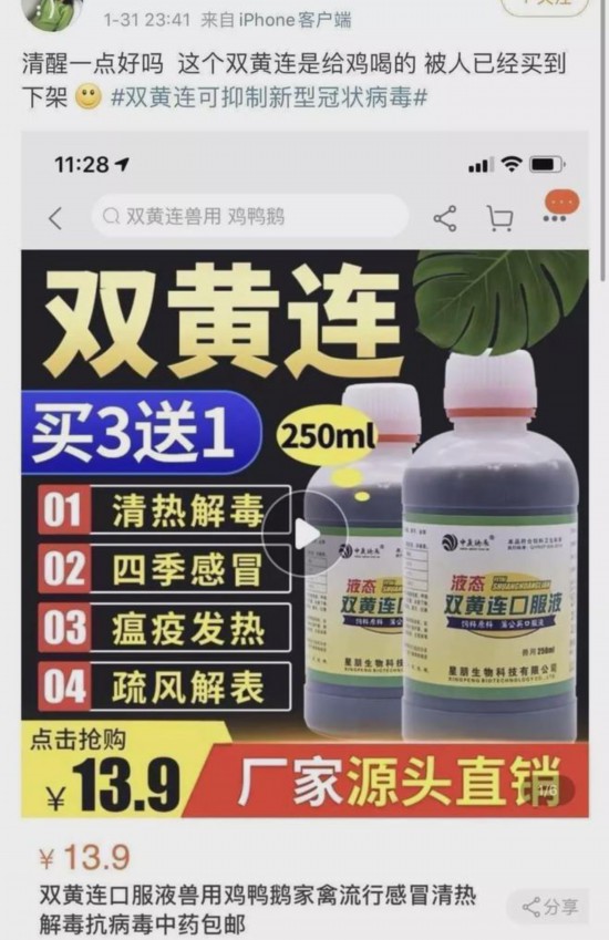 因为抢购,还闹出了不少“笑话”。有网友发现,同样名为双黄连口服液,但却为兽用药的几款产品也在当天晚上迎来销量激增,让人哭笑不得。