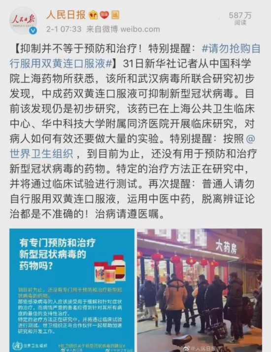 双黄连,一夜抢空近日,经过中国科学院上海药物所和武汉病毒所联合研究,初步发现中成药双黄连口服液可抑制新型冠状病毒(2019-nCoV)。消息出来几小时后,线上线下都已火速脱销。双黄连真的有效吗?中国科学院上海药物所深夜回应。“请勿抢购双黄连”中新网记者当晚向中科院上海药物所求证时,相关人员表示,目前是初步发现对(新型冠状)病毒有抑制作用,但是对病人如何有效,还要做大量试验。