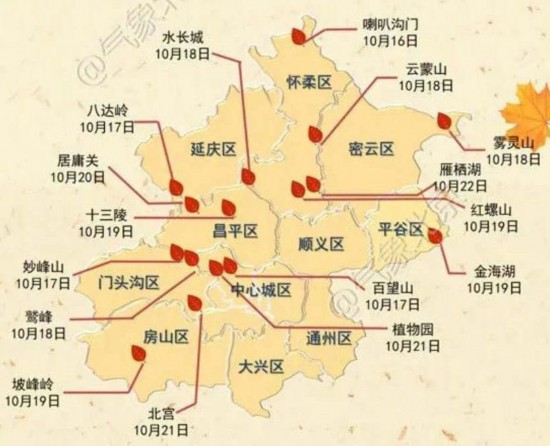 公众可以在气象北京公众号每天接收到红叶观赏期预报的服务产品,这也是气象服务部门根据气象要素和植物自身生长激素含量等影响因子,建立预测模型,并综合分析近期多种天气要素生成的服务产品。