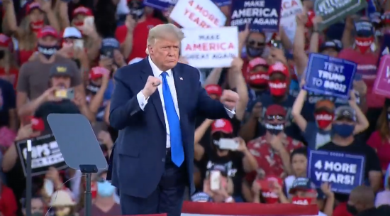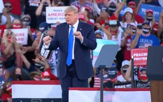 【环球网报道】刚刚,美国总统特朗普结束了在内华达州举行的最新一场竞选活动。根据福克斯新闻等美国媒体视频直播报道,特朗普演讲结束后,集会现场放起歌曲《Y.M.C.A》,而特朗普在舞台上不时用表情以及动作与支持者互动,还随着音乐扭动身体。特朗普当天也并未佩戴口罩。