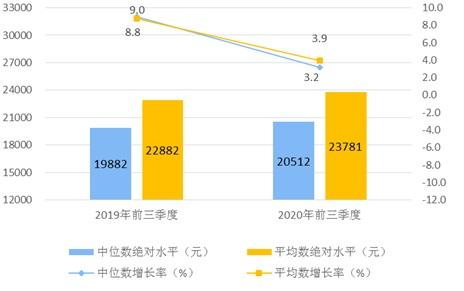 前三季度,全国居民人均可支配收入中位数20512元,增长3.2%,中位数是平均数的86.3%。其中,城镇居民人均可支配收入中位数30015元,增长2.4%,中位数是平均数的91.5%;农村居民人均可支配收入中位数10650元,增长4.7%,中位数是平均数的86.6%。
