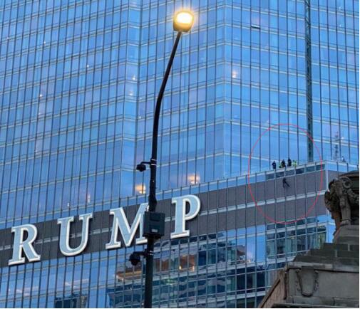 报道称,特朗普大厦总共98层,从现场视频可以看出,这名男子悬吊的位置旁边,正好就是大厦上的“特朗普”LOGO的位置。