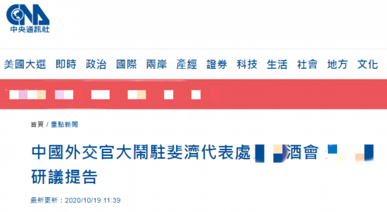 “中央社”19日援引外媒《亚太报告》Asia Pacific Report报道,宣称台“驻斐济代表处”在10月8日在当地旅馆办理酒会时,有2名大陆外交人员“强行闯入”,还攻击了一位台湾“驻处”人员。根据报道,大陆外交人员主张外交豁免权,斐济警方便无进一步行动。外事部门“政务次长”曾厚仁今日(19日)在“立法院”宣称,将持续观察此为有计划、普遍现象,还是单一事件,还说会朝提告方向研议。