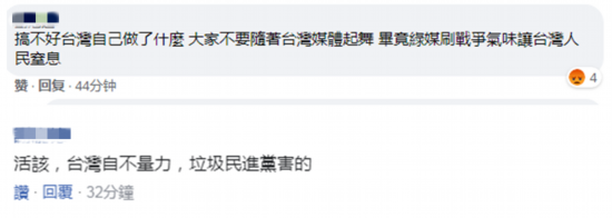 针对此事,有不少岛内网友在脸书或台媒评论区留言,称“搞不好台湾自己做了什么,大家不要随着台湾媒体起舞,毕竟绿媒刷战争气味让台湾民众窒息”“活该,台湾自不量力,垃圾民进党害的。”
