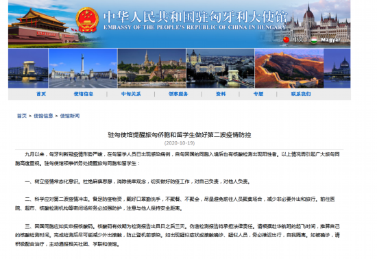 九月以来,匈牙利新冠疫情形势严峻,在匈留学人员已出现感染病例,自匈回国的同胞入境后也有核酸检测出现阳性者。以上情况需引起广大旅匈同胞高度重视。驻匈使馆领事侨务处提醒旅匈同胞和留学生: