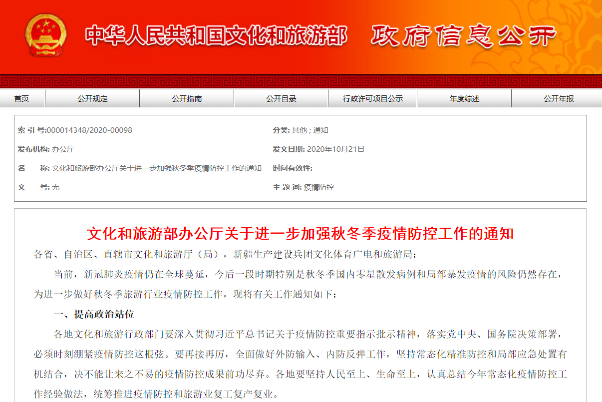 据文旅部网站10月21日消息,当前,新冠肺炎疫情仍在全球蔓延,今后一段时期特别是秋冬季国内零星散发病例和局部暴发疫情的风险仍然存在,为进一步做好秋冬季旅游行业疫情防控工作,现将有关工作通知如下: