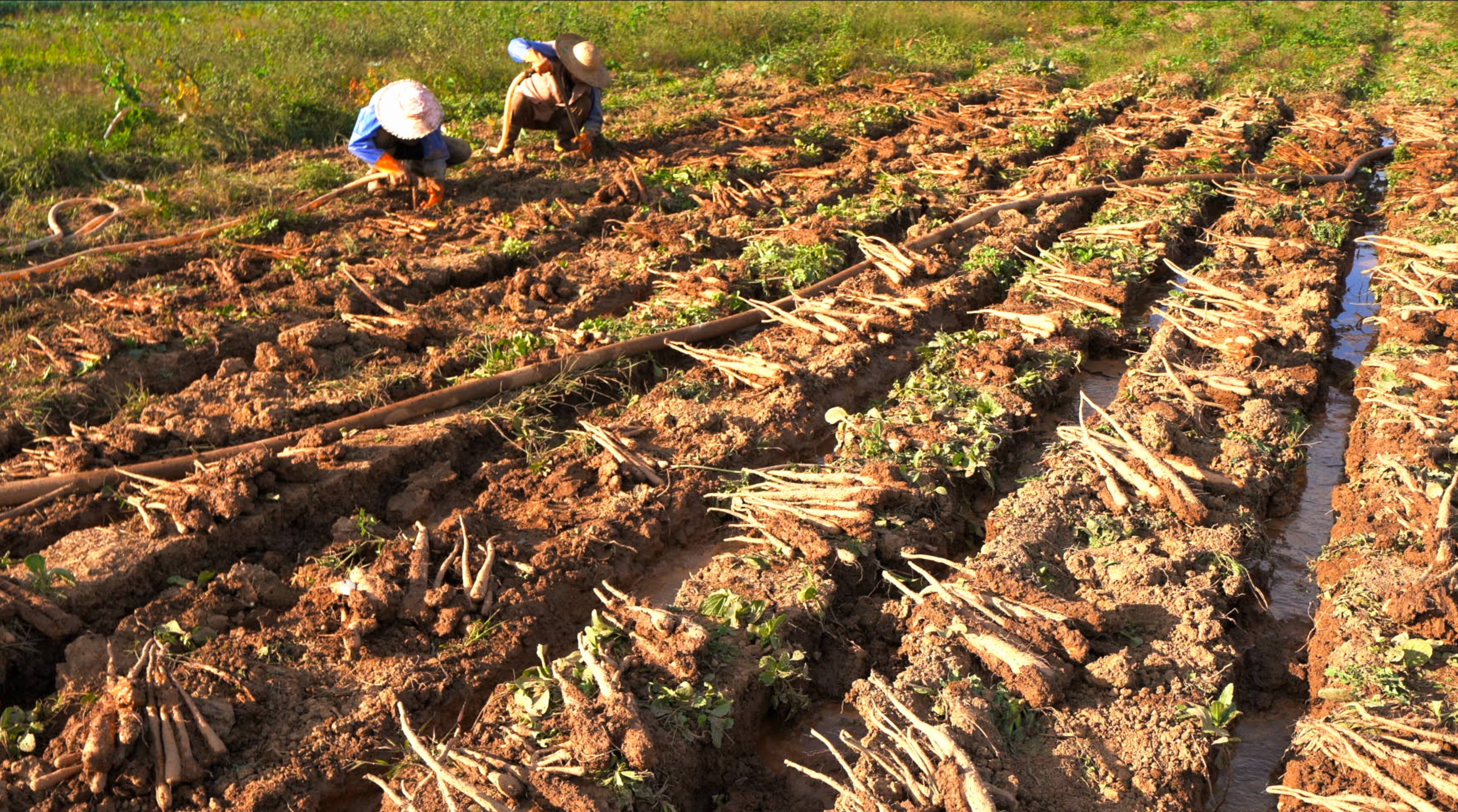 不远处的山药地里,几个农民正忙着“冲山药”——这是合作社发明的既省劳力又不损坏山药的土方法,用高压水枪将一条条墒沟的泥土冲散,再伸入土内冲击根部泥土,一根根裸露出来的山药完好地被“揪”出来。体态标准的山药个头大概在四五十公分,粗细均匀,最长的要超过1米。