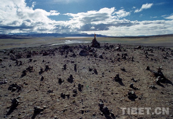 这是辽阔的藏北高原。前景是信教群众用小石块垒起的一个个祭天神的小石堆(唐召明1998年摄)