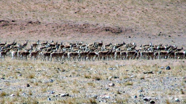 这是羌塘国家级自然保护区正在迁徙中的国家一级保护动物藏羚羊中的雌性藏羚羊(唐召明2006年摄)