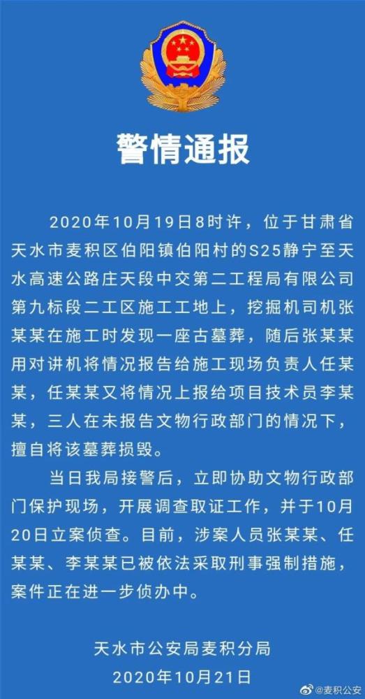 10月21日,甘肃天水麦积警方发布通报称,10月19日8时许,位于甘肃省天水市麦积区某施工工地上,挖掘机司机张某某在施工时发现一座古墓葬,随后张某某将情况报告给施工现场负责人任某某,任某某又将情况上报给项目技术员李某某,三人在未报告文物行政部门的情况下,擅自将该墓葬损毁。
