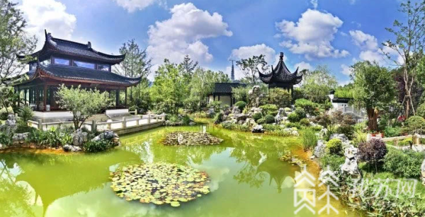 江苏园的建设工艺精、质量高、效果好,是整个绿博园区的精品和亮点,被全绿委办确定为开幕式嘉宾巡展的6个展园之一。展园内亭台楼榭错落有致,小桥流水逶迤环绕,太湖石、银杏、宝华玉兰、金镶玉竹等富有江苏特色的植物与古典建筑和谐配置,使得“山、水、林、园”融为一体,把以江南园林为代表的江苏灵秀精巧展现得淋漓尽致,巧妙地展示了绿美江苏建设的特色与成效,体现了江苏人干实事、出精品的一贯风格。