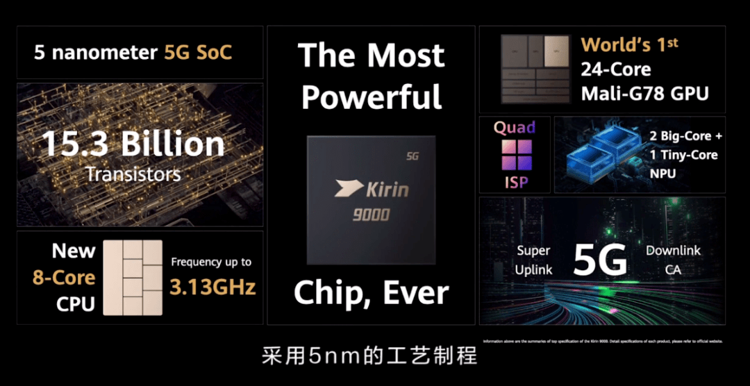 麒麟9000芯片内共集成了153亿个晶体管。CPU部分八核心,包括一个3.13GHz A77大核心、三个2.54GHz A77中核心、四个2.04GHz A55小核心,略微超过骁龙865 Plus 3.1GHz,是目前频率最高的手机处理器;同时集成24核心的Mali-G78GPU,性能提升60%,功耗大幅降低。