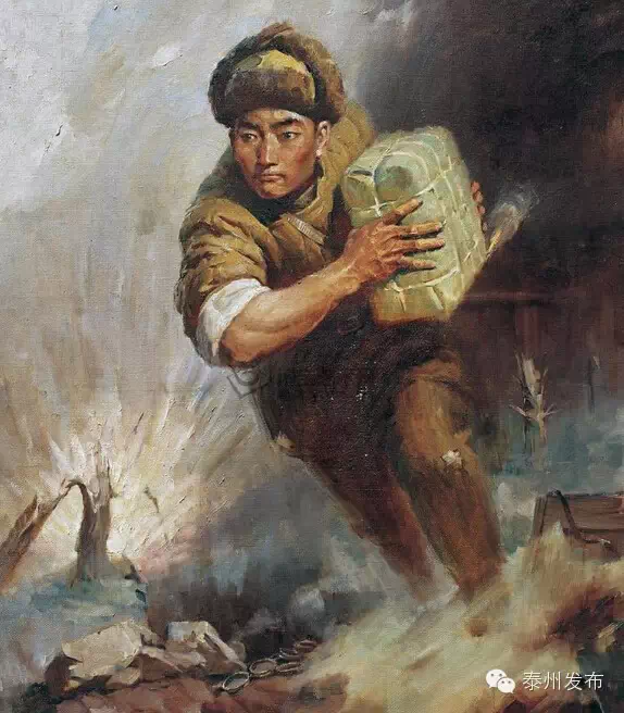 大批敌人已快要涌上山头,杨根思抱着炸药包,踏着美陆战一师的军旗,冲入敌群。一声巨响,敌人粉身变泥土,英雄辉煌化金星!