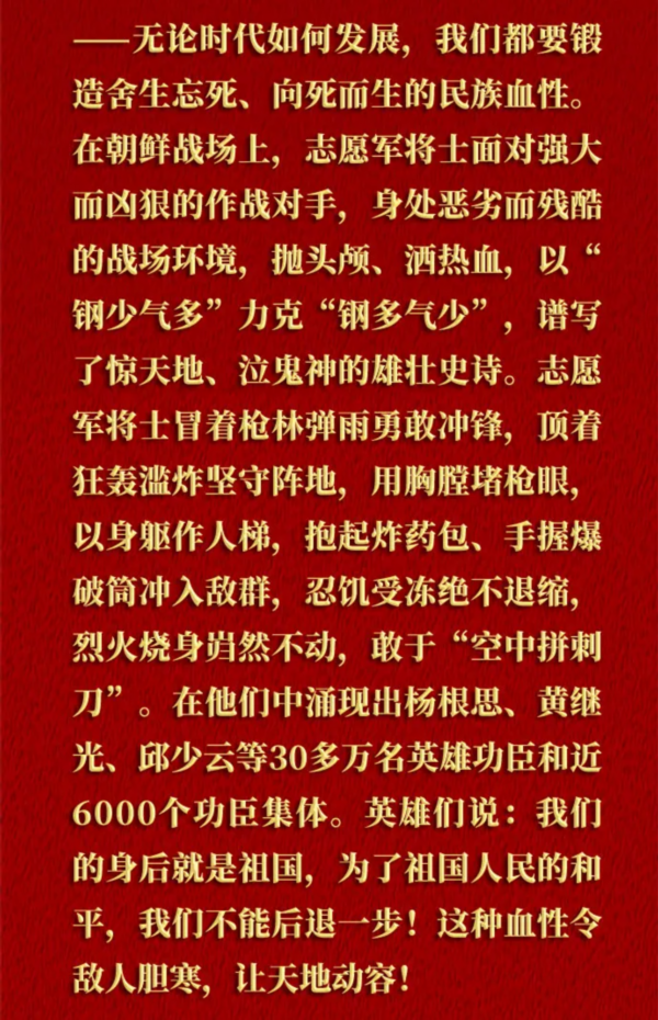 在讲到“锻造舍生忘死、向死而生的民族血性”时,习近平总书记说志愿军将士中涌现出杨根思、黄继光、邱少云等30多万名英雄功臣和近6000个功臣集体。