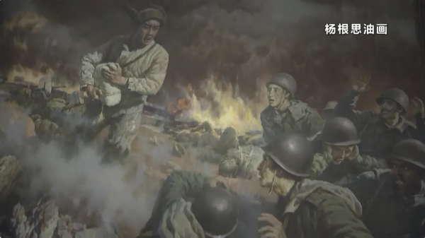杨根思穿着一件装有18颗手榴弹的“背弹衣”,趁着轻重机枪、六〇炮将敌人火力压下去的短暂时刻,穿过开阔地,冲到敌人的屋檐下。班长吴春林带领战士紧跟着冲了过去,命令大家用十字镐把门砸开。正砸间,屋顶上的伪军扔下排子手榴弹,战士死伤多人。