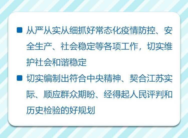 娄勤俭强调,党的十九届五中全会即将召开,全省上下要从严从实从细抓好常态化疫情防控、安全生产、社会稳定等各项工作,切实维护社会和谐稳定。要认真落实中央的安排部署,充分吸收各方面的意见,加强与国家发展规划、专项规划、区域规划、空间规划的衔接,抓紧对我省规划《建议》进行修改完善,切实编制出符合中央精神、契合江苏实际、顺应群众期盼、经得起人民评判和历史检验的好规划。