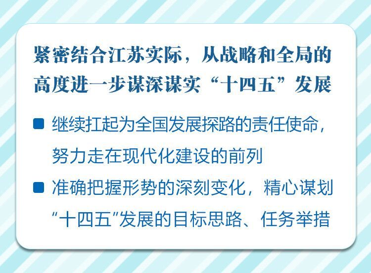 娄勤俭强调,要紧密结合江苏实际,从战略和全局的高度进一步谋深谋实“十四五”发展。江苏“十三五”发展取得了历史性成就,我们有足够的信心和底气走好下一步的路。面向“十四五”发展,我们要继续扛起为全国发展探路的责任使命,努力走在现代化建设的前列,一步一个脚印将习近平总书记擘画的美好蓝图变成生动现实。要准确把握形势的深刻变化,精心谋划“十四五”发展的目标思路、任务举措,细化研究相关的重大政策、重大产业、重大项目、重大平台、重大载体,更好地支撑江苏未来发展。
